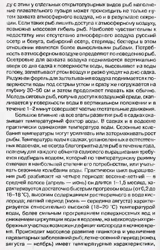 Температура воды. У рыб как представителей пойкилотермных животных интенсивность обмена определяется температурой воды. Температурный диапазон жизнедеятельности обусловлен видовой принадлежностью и закрепляется наследственно, но в его пределах обмен веществ может быть более высоким или низким. При повышении температуры необходимо улучшать условия газообмена.