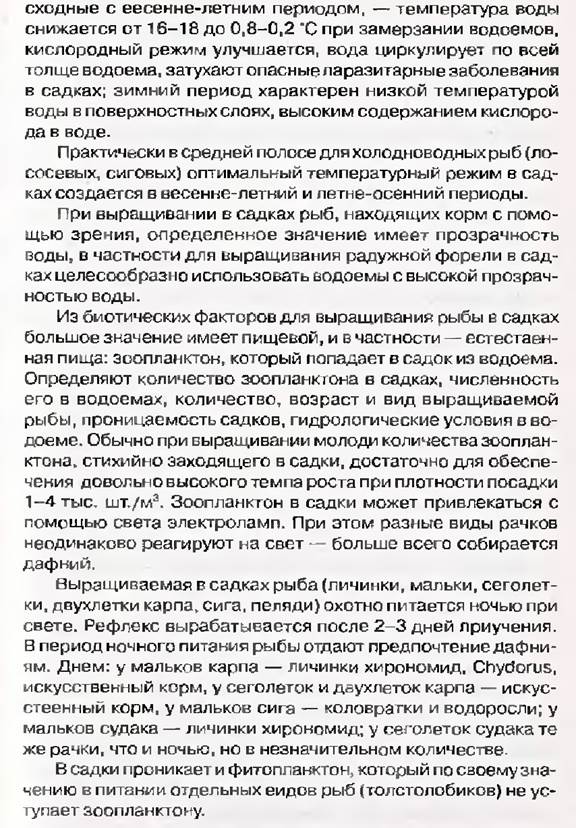 Процесс выращивания рыбы в садках может быть успешным при полном соответствии условий среды требованиям выбранного культивируемого объекта. Это может быть достигнуто путем подбора соответствующего водоема или отдельных его акваторий, а также при выборе подходящих периодов выращивания.