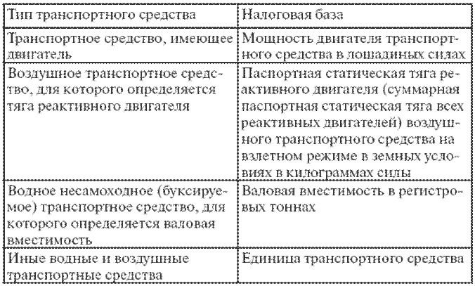 Налоговая базаопределяется в зависимости от типа транспортного средства (табл. 16.1).