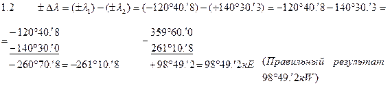 Аналогично возможно неправильное применение «правила знаков» при мысленном раскрытии скобок алгебраической формулы по вычислению разности долгот двух точек: