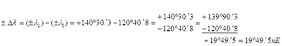 Таким образом, «проверочный чертеж» не подтвердил правильность вычисления разности долгот двух точек с помощью формулы, т.к. согласно этому чертежу наименование разности долгот получается «к западу» (кW), а по результатам вычисления – наименование этой разности долгот получилось «к востоку» (кЕ).