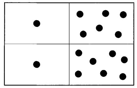 Дети вновь проходят за стол. Логопед раздает им игровые карты, а на столе раскладывает предметные картинки с изображениями одной и нескольких игрушек. Каждый ребенок получает карту, разделенную на 4 части. В двух частях, расположенных слева, нарисовано по одному кружку. В двух частях, расположенных справа, нарисовано по несколько кружков (рис. 4).