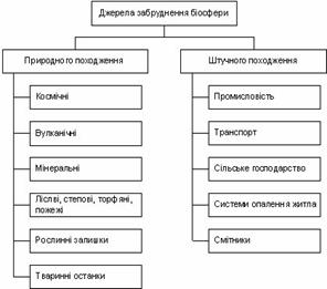 Основні джерела забруднення біосфери, що утворюються природними, виробничими і побутовими процесами, можуть бути об’єднані в дві групи: