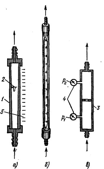 Витратомір дросельного типу (рис. 1,в) побудовано за принципом вимірювання перепаду тиску на ділянках до і після діафрагми 3 (P1 і Р2), що дроселює. Цей перепад залежить від витрати газу і замірюється манометрами 4.