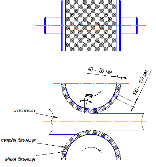 I. Робочий шар горизонтальних валів прокатувальних станів повинен бути не тільки зносостійким, але і мати високу розгаростійкість, крім того забезпечувати рівномірний, без пробуксовок захват прокотуємого металу, що дозволяє виключити перенавантаження обладнання і поломки обладнання головної лінії стана. Вказаним вимогам відповідає конструкція прокатного вала, робочий шар якого складається з чергуючихся в шаховому порядку дільниць матеріалів з різним рівнем твердості, міцності, пластичності, зносостійкості. У процесі експлуатації такого вала – дільниці з меншою зносостійкістю зношуються скоріше, за рахунок чого оголюються дільниці з більшою зносостійкістю, які сприймають на себе робоче навантаження, що призводить до стабілізації глибини лунок на визначеному рівні, яка регулюється кутом ά, а також різницею у зносостійкості дільниць робочого шару. Наплавлення валка ведуть по гвинтовій лінії двома електродними дротами різного хімічного складу під шаром керамічного флюсу. Змінюючи співвідношення швидкості подачі дротів, але тримають постійним рівень продуктивності наплавки, керують легуванням наплавленого металу. Кут ά отримують змінюючи моменти швидкості подачі дроту при переході.