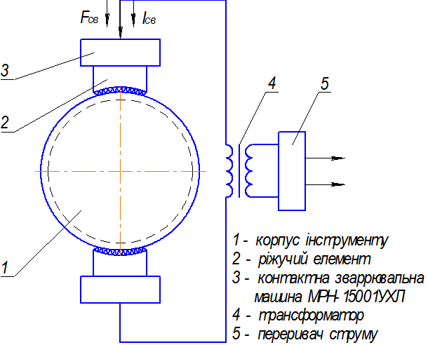 · з’єднують ріжучі елементи з корпусом методом рельєфного зварювання, імпульс струму 0,02 – 0,04 с, щільність струму j = 130 – 160 А/мм2, тиск р = 10 – 15 МПа