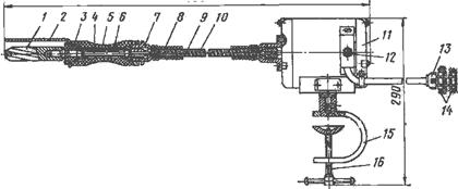 Рис. 5.4. - Пристосування для очищення риби РО – 1М: 1 - скребок; 2 - кожух; 3 - проміжний вал; 4 - ручка; 4 - ручка; 5 - гнучкий вал; 6 - електродвигун; 7 - вилка; 8 - вимикач; 9 - кронштейн із гвинтом.