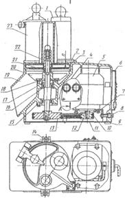 Рис. 6.1. - Машина МИК - 60 для розмелювання кави: 1 – опора; 2 – основа; 3 – амортизатори; 4 – корпус; 5 – електродвигун; 6 – робоча камера; 7 – диск; 8 – магнітний пускач; 9 – фланець; 10 – кришка; 11 – ручка; 12 – планка; 13 – магніт; 14 – бункер завантаження; 15 – відкидна кришка; 16 – магнітний пускач; 17- кільце; 18-електровібратор; 19 панель керування; 20 – втулка; 21- кнопка пуску; 22- демпферна пружина; 23-труба.