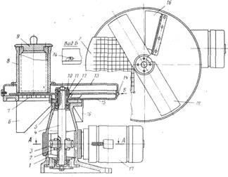 Рис. 6.5. - Машина для подрібнення овочів МП – 800: 1- клинопасова передача; 2- ролико-підшипник; 3- манжети; 4- корпус; 5 –привідний вал; 6 – скидач; 7 – вихідний лоток; 8- бункер; 9 – решітка; 10- заванта-жувальний бункер; 11- ротор; 12 – приймальна воронка; 13 – вісь; 14- люк4 15- ручка; 16- ємність; 17- рама; 18 – електродвигун.