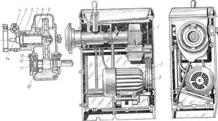 Рис. 8.8. М’ясорубка МИМ-105:1- циліндричний редуктор; 2 – електродвигун; 3- клинопасова передача; 4- вал; 5- хомут; 6- упорний підшипник; 7 – вихідний вал; 8- підшипник ковзання; 9 – косозубе колесо; 10 – втулка; 11 – вхідний вал; 12- радіальні шарикопідшипники; 13 – шестерня; 14 – вилка.