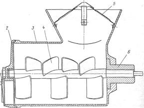 Рис. 9.1 Фаршемішалка МС 8 – 150: 1 –заслінка; 2 – кришка; 3- корпус; 4 – лопаті; 5 – запобіжна хрестовина відкидний гвинт;6 –хвостовик.