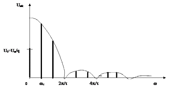 Интервал между любыми соседними спектральными линиями определяется только частотой следования импульсов и равен wc=2p/Tc . Огибающая амплитудного спектра изменяется по закону функции sin x /x (x=wt/2). Огибающая имеет бесконечное число лепестков, ширина каждого лепестка равна 2p/t . Каждый лепесток содержит q спектральных линий. С ростом периода следования импульсов Тс спектральные линии располагаются теснее и их длина становится меньше (~2Umt/Tc).