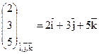 и разложение вектора с координатами 2, 3, 5 в этом базисе можно записать в виде: