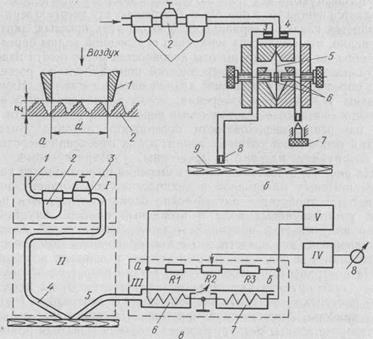 Датчик имеет два наклонных сопла — подающее воздух и приемное — и устанавливается над поверхностью контролируемой детали. Воздух по трубопроводу 1, пройдя фильтр 2 и стабилизатор 3 давления, поступает в подающее сопло 4 датчика. В приемное сопло 5 поступает отраженный от контролируемой поверхности поток воздуха, который направляется в измерительный блок.