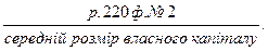 Середній розмір власного капіталу визначається як середньоарифметичне значення статутного капіталу (р.ЗОО ф.№1), пайового капіталу (р.310 ф№1), додаткового вкладеного капіталу (р.320 ф.№1), іншого додаткового капіталу (р.ЗЗО ф.№1), резервного капіталу (р.340 ф.№1), нерозподіленого прибутку (р.350ф.№1), нарахованих учасниками дивідендів (р.590 ф.№1) на початок та кінець звітного періоду.