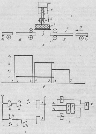 В простых случаях математическую модель системы управления можно составить по словесному описанию работы объекта управления. При этом необходимо определить условия включения и выключения, очередность и продолжительность их действия. Затем по словесному описанию или циклограмме составляют логические уравнения математической модели. Далее проводят анализ полученных уравнений с точки зрения минимизации элементов и, наконец, составляют принципиальную схему управляющего устройства технологическим объектом. Проиллюстрируем эту очередность и условия составления схемы управляющего устройства.