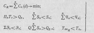 где Сn (d) — затраты на n-м участке на изготовление единицы продукции; d — функция, с помощью которой задается значение векторов М{/ для нахождения множества Mij; Sn, Пп, Чп, Эп — показатели R-го варианта по п-му участку; площадь, производительность, число рабочих, энергозатраты на единицу продукции; Tokr — срок окупаемости капитальных вложений по R-му варианту.