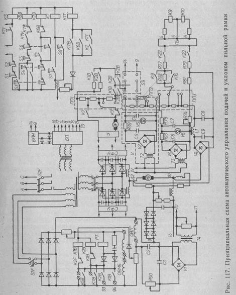 Принципиальная схема управления лесопильной рамой 2Р80 (рис. 115) состоит из силовой части схемы, релейно-контакторной схемы управления и блокировок согласования узлов.