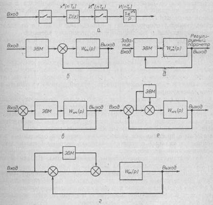 a — эквивалентная дискретного элемента; б—е — структурные включения ЭВМ в контурах САУ