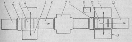 Схемы линий сортировки плит.В производстве плит линии сортировки входят в состав линий ДЛШ50 или ДЛШ100 калибрования плит (рис. 150). Из загрузчика 1 плиты поступают в измерительное устройство 2 для измерения толщины. Если плита толще 19 мм, то по распределительному конвейеру 3 она будет подана в накопитель 4 (на подъемный стол), а плиты тоньше 16,5 мм подаются в накопитель 5. Толстые плиты будут калиброваться на калибровальном станке, переналаженном на большую толщину снимаемого слоя. Если толщина плит лежит в заданном диапазоне, то по конвейеру 6 плита поступит в калибровальный станок 7. После калибрования плиту контролирует толщиномер 8. На основании данных прибора и команды оператора, который находится на посту 9, синтезируется сигнал о сорте, к какому относится плита, т. е. о качестве плиты. Когда плита выйдет из калибровального станка, включается повышенная скорость конвейера и плита с распределителя 10 передается на один из накопителей 11, 12 или 13. Накопители, распределители и автоматические толщиномеры унифицированы. Особенностью управления сортировкой является то, что команда на сброс реализуется за один цикл, система не имеет блока оперативной памяти.