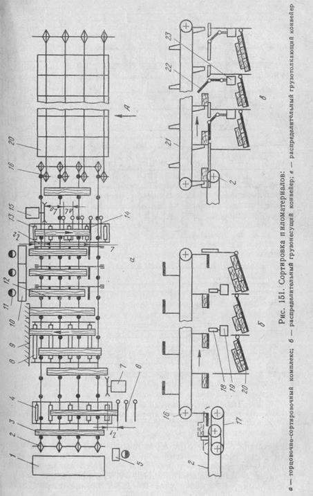 Упоры сопровождения 14 (заданного номера) выдвигаются, и конвейер 13 смещает доску вправо. Оторцовка производится пилой 15. Конструкция упоров сопровождения позволяет всем операторам задавать одновременно одинаковые длины досок. После оторцовки доски поступают на конвейер 16, который распределяет доски по карманам-накопителям 20. Распределительные конвейеры могут быть грузонесущими (рис. 151, б). С конвейера 2 доска ускорительным конвейером 17 передается на крючья грузонесущего конвейера. Для сброса в требуемый накопитель выдвигается упор 18 с помощью исполнительного механизма 19 (электромагнита, пневмоцилиндра, электрогидравлического толкателя). Существуют также грузотол-кающие конвейеры 21 (рис. 151, в). Доска перемещается по направляющим. Для сброса в карман-накопитель открывается клапан 22 с помощью исполнительного механизма 23.