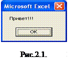 Результатом работы данной процедуры является информационное сообщение, выведенное в виде диалогового окна (рис.2.1.). Поскольку в процедуре MsgBox отсутствуют параметры атрибуты и заголовок, то в диалоговом окне выведена только одна обязательная кнопка OK, которая используется для закрытия окна, и в заголовке окна выведено имя приложения – Microsoft Excel.