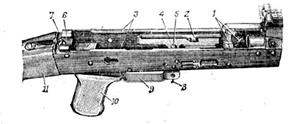 1 – вырезы; 2 – отражательный выступ; 3 – отгибы; 4 – направляющий выступ; 5 – перемычка; 6 – продольный паз; 7 – поперечный паз; 8 – защёлка магазина; 9 – спусковая скоба; 10 – пистолетная рукоятка; 11 – приклад
