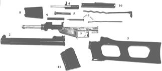 1 – ствол; 2 – ствольная коробка; 3 – основание приёмника; 4 – затворная рама с затвором; 5 – возвратный механизм с буферным устройством; 6 – крышка приёмника; 7 – спусковой механизм; газовый цилиндр; 9 – рукоятка перезаряжания