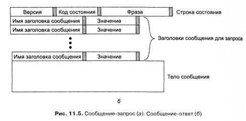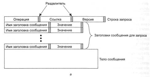 Всякая связь между клиентом и сервером осуществляется посредством сообщений. HTTP различает только два вида сообщений — сообщения-запросы и сообщения-ответы. Как показано на рис. 11.5, а, сообщения-запросы состоят из трех частей. Строка запроса (request line) имеет стандартный вид и определяет операцию, которую клиент хочет выполнить на сервере, а также ссылку на документ, связанный с запросом. Отдельное поле требуется для указания версии HTTP, которую использует клиент. В качестве операций(методов) могут быть указаны GET, POST, HEAD, PUT, DELETE и другие. В качестве ссылки чаще всего используется URL-адрес ресурса.