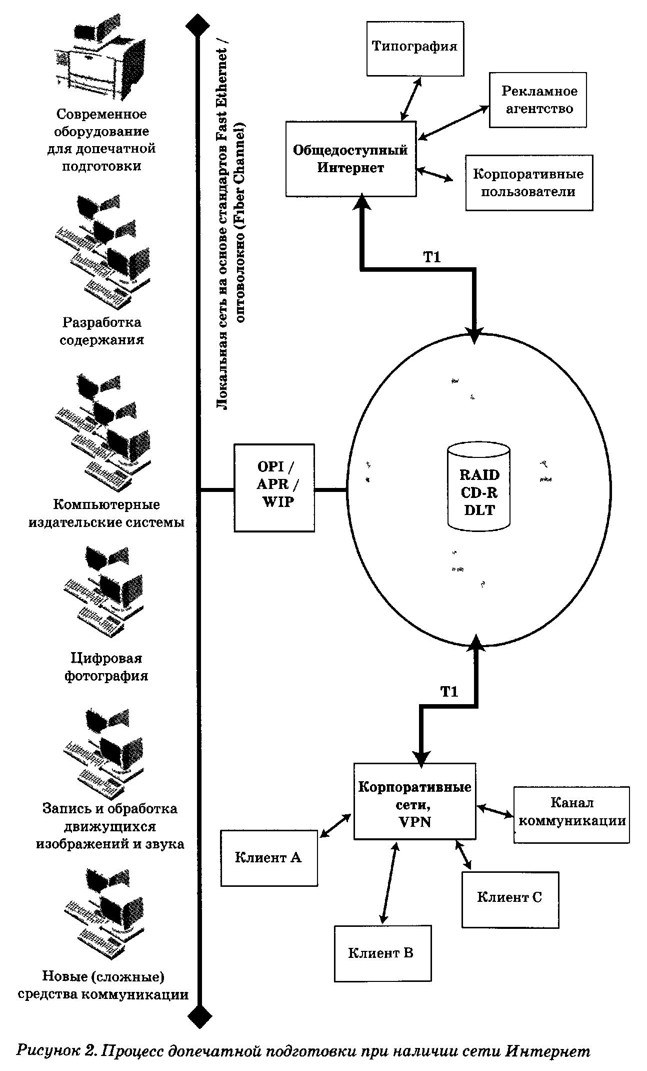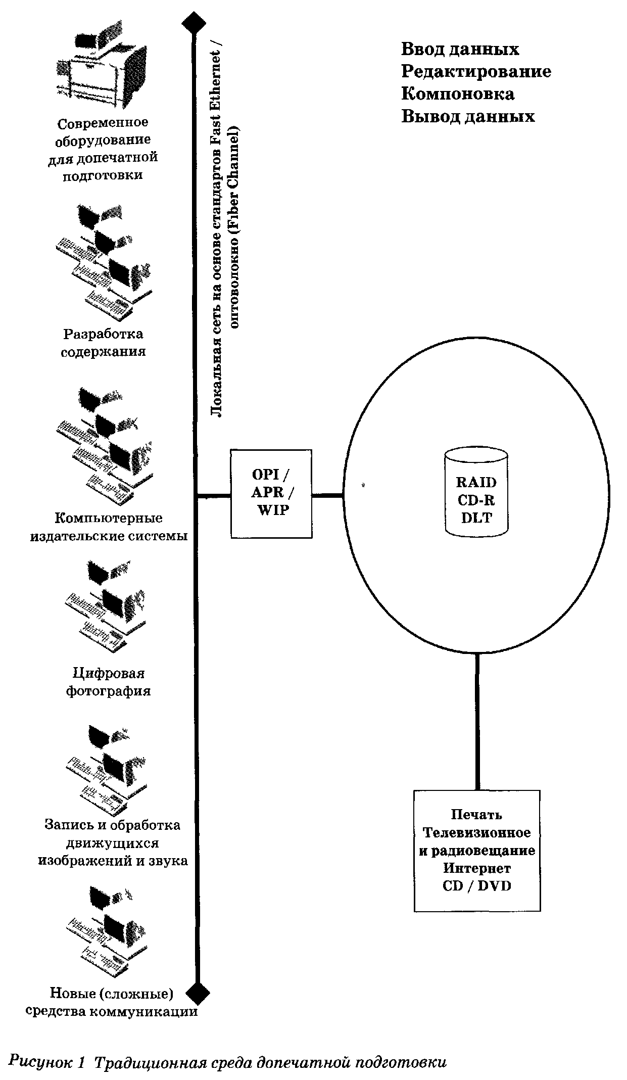 Как показано на Рисунке 1, традиционный процесс допечат- ной подготовки в полиграфии содержит все основные компоненты, необходимые для кросс-медийного издательского процесса. Это хорошая новость для нашей отрасли - полиграфии и издательского дела. Говорите ли вы на языке печати, движущихся изображений (видео), Интернета, звукового вещания (аудио) - фундаментальные принципы подготовки информации одни и те же: ввод данных, редактирование, компоновка и вывод данных. Как специалист в области полиграфии и издательского дела, я утверждаю, что у вас есть преимущество на старте. Вы на пятнадцать лет опережаете индустрию средств вещания (видео и радио) в понимании того, каким образом компьютерная подготовка изданий (desktop publishing) - или «издательский процесс во Всемирной Паутине («Web Top Publishing») - вписывается в постоянно обновляющуюся среду коммуникаций.