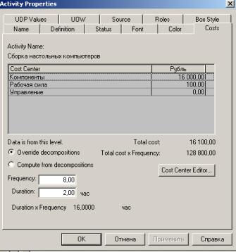 Для задания стоимости работы (для каждой работы на диаграмме декомпозиции) следует щелкнуть правой кнопкой мыши по работе и на всплывающем меню выбрать Cost (рис. 8.4). В диалоге Activity Cost указывается частота проведения данной работы в рамках общего процесса (окно Frequency) и продолжительность (Duration). Затем следует выбрать в списке один из центров затрат и в окне Cost задать его стоимость. Аналогично назначаются суммы по каждому центру затрат, т. е. задается стоимость каждой работы по каждой статье расхода. Если в процессе назначения стоимости возникает необходимость внесения дополнительных центров затрат, диалог Cost Center Editor вызывается прямо из диалога Activity Properties/Cost соответствующей кнопкой.