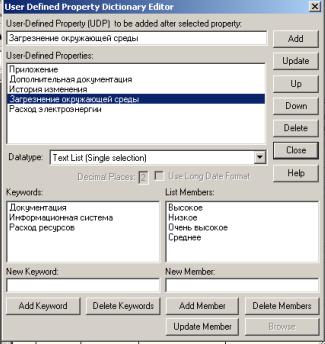 Для описания UDP служит диалог User-Defined Property Editor (меню Model/UDP Definition Editor) (рис. 8.7). В верхнем окне диалога вносится имя UDP, в списке выбора Datatype описывается тип свойства. Имеется возможность задания 18 различных типов UDP, в том числе управляющих команд и массивов, объединенных по категориям. Для внесения категории следует задать имя категории в окне New Keyword и щелкнуть по кнопке Add Category. Для присвоения свойства категории необходимо выбрать UDP из списка, затем категорию из списка категорий и щелкнуть по кнопке Update. Одна категория может объединять несколько свойств, в то же время одно свойство может входить в несколько категорий. Свойство типа List может содержать массив предварительно определенных значений. Для определения области значений UDP типа List следует задать значение свойства в окне New Keyword и щелкнуть по кнопке Add Member. Значения из списка можно редактировать и удалять.