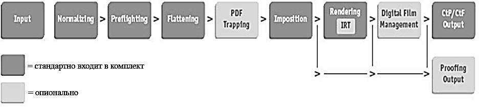 Сначала список программ обычно ограничивался единственным модулем RIP (Raster Image Processor) – так называют программу, конвертирующую входную информацию (обычно документы в формате PostScript) в растровое изображение высокого разрешения для непосредственной отправки на выводное устройство. Благодаря новым требованиям RIP-ориентированные системы постепенно трансформировались в системы workflow.