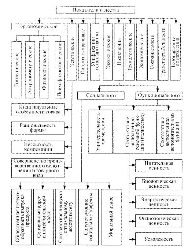 Показатели назначения характеризуют социальную ориентацию и целевую функцию товара. К ним относятся: показатель общественной целесообразности выпуска данной продукции, отражающий потребность населения в продукте и неудовлетворенный спрос; показатель социального адреса и потребительского класса, характеризующий предназначение товаров конкретным группам потребителей. Показатель соответствия продукта оптимальному ассортименту отражает место продукта в фактическом и прогнозируемом ассортименте. Показатель сопутствующих социальных эффектов ориентирует производство на выпуск товаров с измененными свойствами в соответствии с новыми запросами потребителей, например низкокалорийных, витаминизированных, обогащенных биологически ценными компонентами и т.д. Показатель морального износа служит основанием для исключения из ассортимента выпускаемых товаров некоторых изделий, на которые снижается спрос.