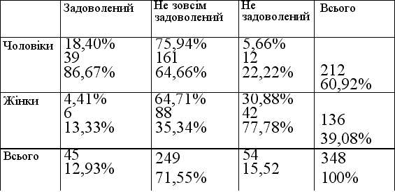 Числа в таблиці свідчать, що серед жінок відсоток незадоволених умовами праці на підприємстві значно вищий, ніж серед чоловіків. Отже, є підстави для гіпотезіи, що стать працівника та його задоволеність умовами праці взаємопов'язані.