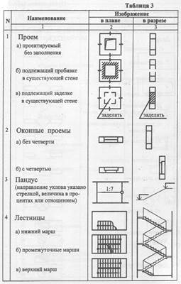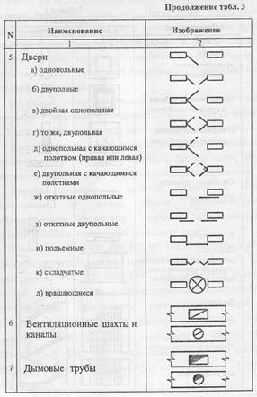 На планах этажей показывают открывание ворот, дверей, вычерчивают лестницы, санитарно-технич. оборудование и т.п. Условные обозначения этих элементов приведены в табл. 3.