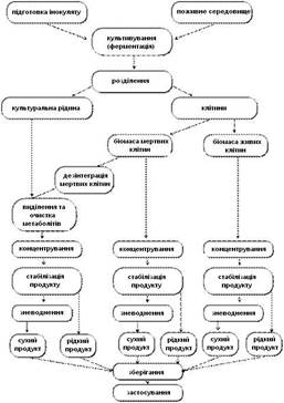 Велика розмаїтість біотехнологічних процесів, які знайшли промислове застосування, призводить до необхідності розглянути загальні, найбільш важливі проблеми, що виникають при створенні будь-якого біотехнологічного виробництва. Процеси промислової біотехнології розділяють на 2 великі групи: виробництво біомаси й одержання продуктів метаболізму. Однак така класифікація не відбиває найбільш істотних з технологічної точки зору аспектів промислових біотехнологічних процесів. У цьому плані необхідно розглядати стадії біотехнологічного виробництва, їх подібності і відмінності залежно від кінцевої мети біотехнологічного процесу. У загальному вигляді система біотехнологічного виробництва продуктів мікробного синтезу представлена на рис. 1.