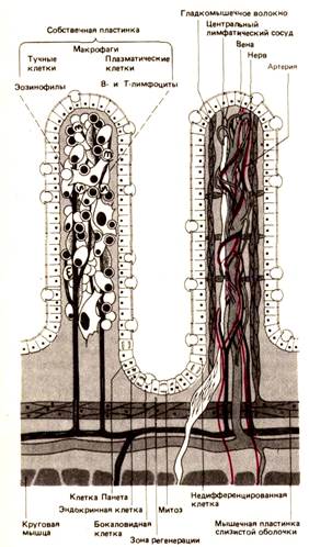 Рис.29.32. Поперечное сечение двух ворсинок тонкого кишечника и крипты между ними, на котором видны несколько типов клеток слизистой и структуры, находящиеся внутри ворсинки