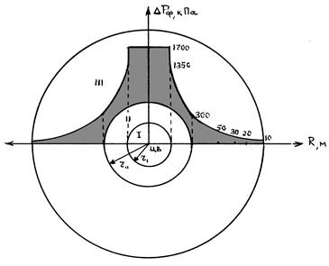 Надмірний тиск у межах зони II змінюється від 1350 до 300кПа і може бути визначений на заданій відстані R0 від ЦВ за формулою