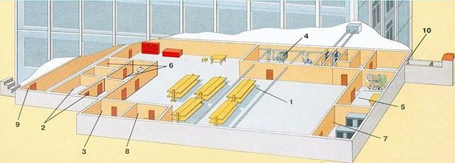 До допоміжних - фільтровентиляційне приміщення, приміщення для дизельної електростанції (ДЕС), приміщення для зберігання продуктів, тамбур-шлюз, санітарний вузол та інші.