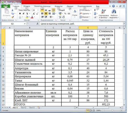На рисунке 2.5 приведён пример электронной таблицы, созданной при помощи Microsoft Office Excel. В ячейках Е4¸Е16 рассчитывается стоимость материалов на 100 пар обуви путём умножения данных в ячейках С4¸С16 на данные в ячейках D4¸D16. В ячейках Е4¸Е16 записаны формулы: Е4*D4, Е5*D5, … Е16*D16, хотя на экране даётся уже результат вычисления. В ячейке Е17 вычисляется итог путём суммирования данных в ячейках Е4¸Е16. В ячейке записана формула суммы. После того как таблица готова, можно менять в ней данные, а произведения и сумма будут рассчитываться и изменяться автоматически.