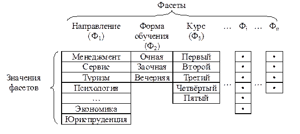 Общая схема построения фасетной системы классификации в виде таблицы отображена на рисунке 3.2. Названия столбцов соответствуют выделенным классификационным признакам (фасетам), обозначенным Ф1, Ф2, …, Фi, …, Фn. В каждой клетке таблицы хранится конкретное значение фасета. Количество значений (строк таблицы) для разных фасетов может отличаться. Например, если фасет «Год рождения» обычно характеризуется четырёхзначным числом (а это 10000 различных значений), то для фасета «Пол» можно ограничиться двумя значениями.