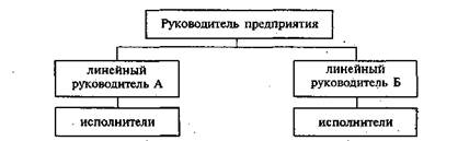 Как видно из рисунка, при линейном управлении каждое звено и каждый подчиненный имеют одного руководителя, через которого по одному каналу походят все команды управления. В этом случае управленческие звенья несут ответственность за результаты всей деятельности управляемых ими объектов. Речь идет о по объектном выделении руководителей, каждый из которых выполняет все виды работ и принимает решения, связанные с управлением данным объектом. Поскольку в линейной структуре управления решения передаются по цепочке «сверху вниз», а сам руководитель нижнего звена управления подчинен руководителю более высокого уровня, формируется своего рода иерархия руководителей конкретной организации. В данном случае действует принцип единоначалия, суть которого состоит в том, что подчиненные выполняют распоряжения только одного руководителя. Вышестоящий орган управления не имеет права отдавать распоряжения каким-либо исполнителям, минуя их непосредственного начальника.