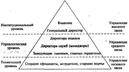 Под уровнем управления понимают совокупность звеньев управления, занимающих определенную ступень в системе управления гостиницей. Ступени управления находятся в вертикальной зависимости и подчиняются друг другу: менеджеры более высокой ступени управления принимают решения, которые конкретизируются и доводятся до нижестоящих звеньев.