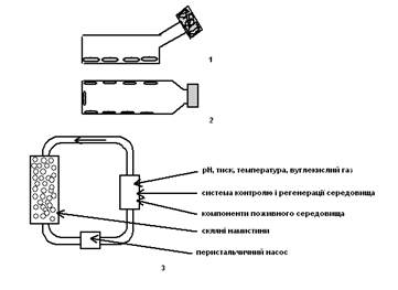 Рис. 1. Основні напрямки способів культивування: 1. Культивування в пласких флаконах (матрацах). Чашка Колле з клітинами на дні. 2. Культивування в суліях, які постійно обертаються, коли в кожен момент часу 15 – 20% поверхні сулії вкрито поживним середовищем, а клітини перебувають поперемінно те в середовищі, то в повітрі. 3. Культивування в колонках на мікроносіях, у якості яких виступають щільно упаковані скляні намистини діаметром 35 мм, що не зміщуються, стопка пластин й ін., а поживне середовище омиває їх, протікаючи зверху вниз.