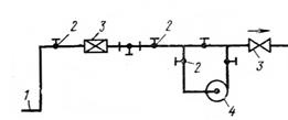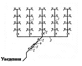 | Рис. 11. Схема внутрішнього водопроводу без водонапірного резервуара і насоса, що підкачує (з нижнім розведенням): 1 – стояки; 2 –запірні вентилі; 3 –розвідна (магістральна) лінія; 4 – трійник із пробкою для спускання води із системи; 5 – водомір | Рис. 12. Схема водопровідного введення в будинок з насосом, що підкачує: 1 – уведення; 2 – запірні клапани; 3 – водомір; 4 – насос; 5 – зворотній клапан |