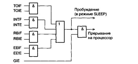 Бит общего разрешения/запрещения прерывания GIE (INTCON <7>) разрешает (если =1) все индивидуально незамаскированные прерывания или запрещает их (если = 0). Каждое прерывание в отдельности может быть дополнительно разрешено/запрещено установкой/сбросом соответствующего бита в регистре INTCON.