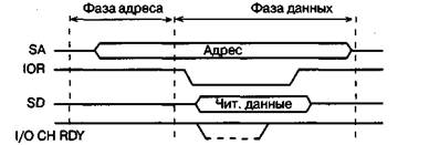 В фазе данных цикла чтения (рис. 2.6) процессор выставляет отрицательный сигнал чтения данных из устройства ввода/вывода -IOR. В ответ на него устройство-исполнитель должно выдать на шину данных SD свой