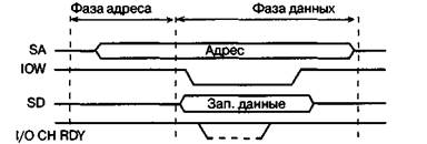 В фазе данных цикла записи по магистрали ISА (рис. 2.7) процессор выставляет на шину данных SD код записываемых данных и сопровождает их стробом записи данных в устройство ввода/вывода –IOW. Получив этот сигнал, устройство-исполнитель должно принять с шины SD код записываемых данных. Если оно не успевает сделать это в темпе процессора, то оно может снять на нужное время сигнал I/O СН RDY после получения переднего фронта сигнала -IOW. Тогда процессор приостановит окончание цикла записи.