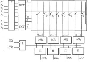 Основные элементы структурной схемы: матрица элементов памяти (ЭП), дешифраторы строк DCX и столбцов DCY, селекторы MS0-MS3,, адресный формирователь F, усилители считывания П. Элемент памяти представляет собой резистивную или полупроводниковую (диодную, транзисторную) перемычку, размещенную на пересечении строки и столбца. Перемычки формируют в процессе изготовления микросхемы в тех точках матрицы, куда следует занести логическую 1. В тех точках матрицы, где должен быть логический 0, перемычку не формируют.